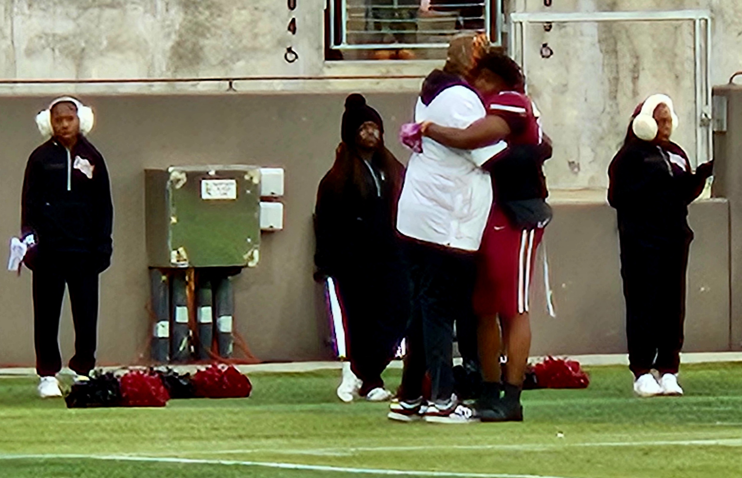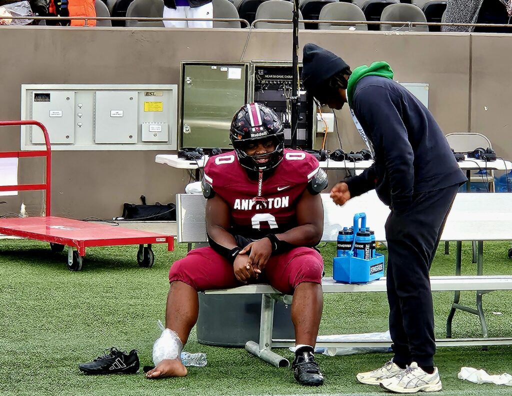 –Anniston’s Jabari Williams helped off of the field at 8:42, looks woosy.