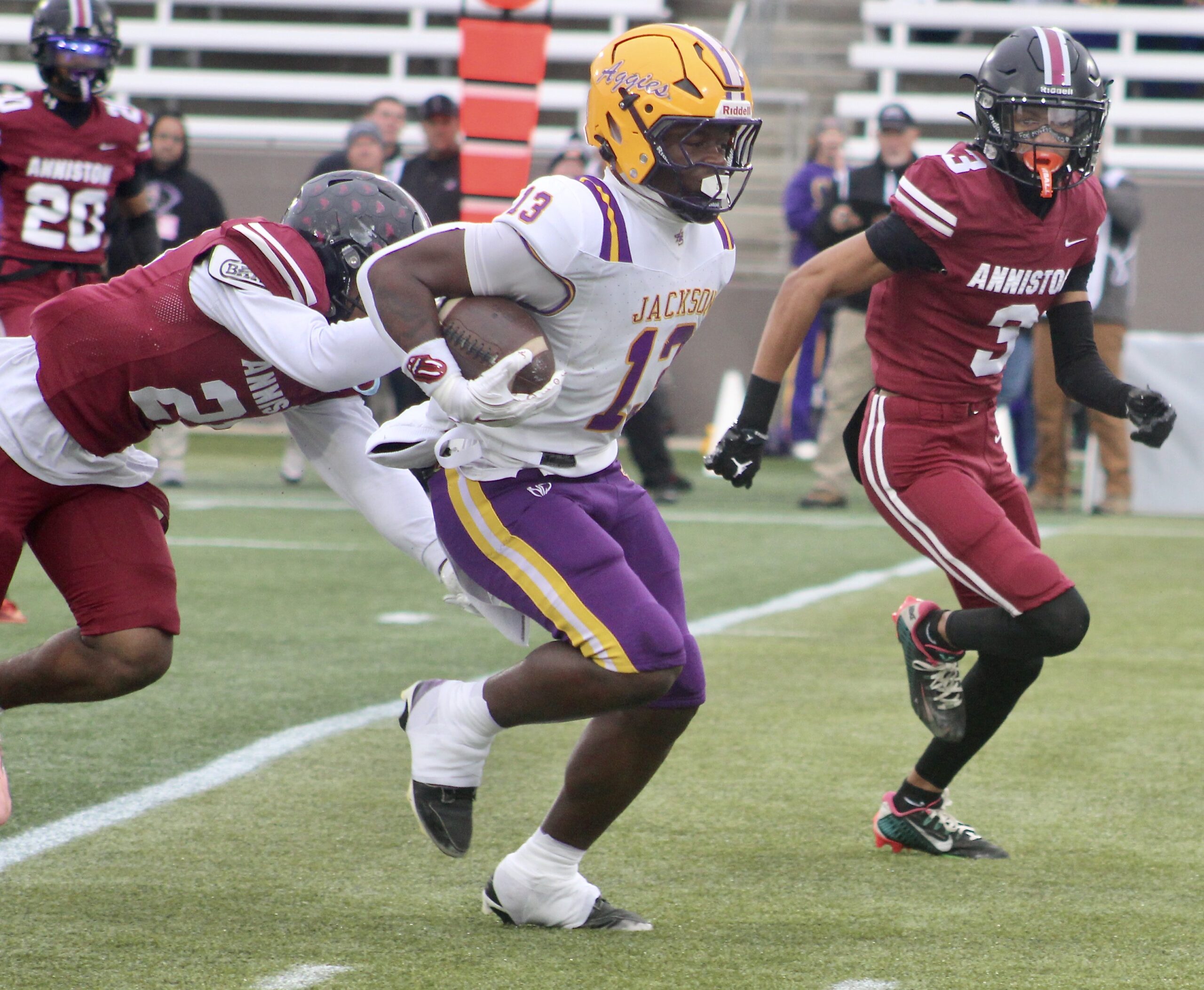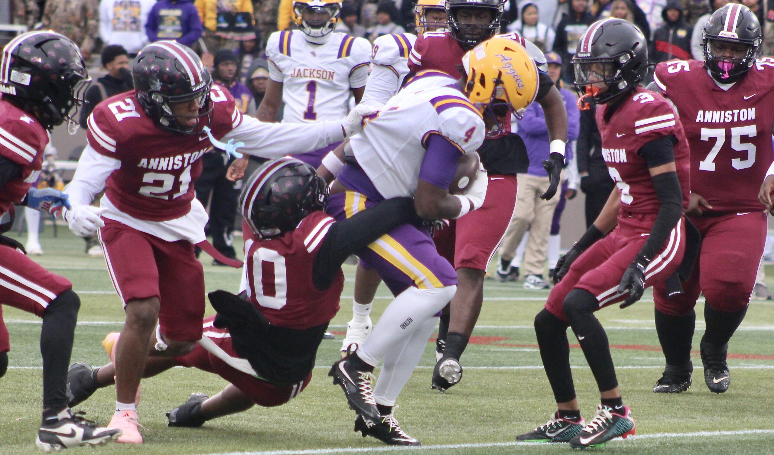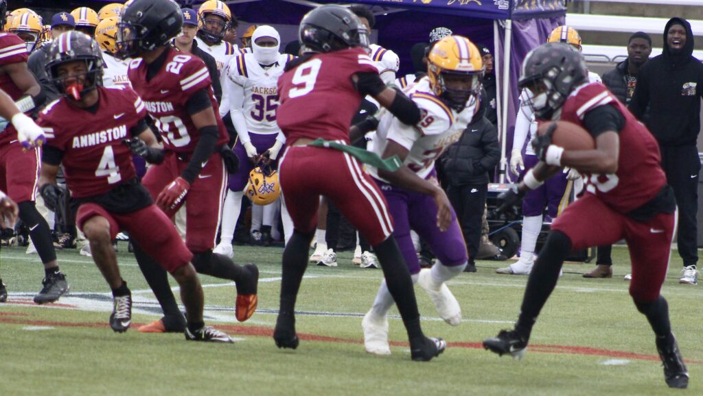 –Jackson’s Aaden Martin with an interception at Jackson’s 20, returns to Anniston’s 42.